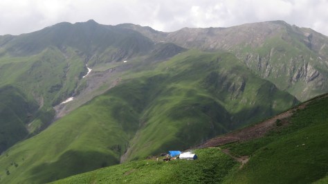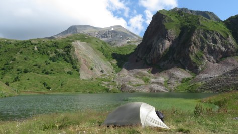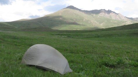 Je finis par atteindre les crêtes. Les deux points d’eau suivants marqués sur la carte ont pour le premier un débit extrêmement faible et pour le deuxième se limite à une vague flaque boueuse. Je poursuis donc même si je commence à sérieusement tirer la langue. Alors que le tonnerre gronde, j’arrive à un vallon avec un ruisseau qui coule. L’endroit est idéal pour le bivouac. Quand la pluie se met à tomber. Je suis installé. J’ai eu le temps de me laver. C’est avec une satisfaction certaine qu’à l’intérieur, propre, au sec, je me repose. 2000 mètres de dénivelés pour aujourd’hui, c’est largement suffisant. Cette première étape est réussie. Elle a bien sûr été solitaire. J’ai juste croisé un Arménien qui ramassait des plantes dans la montagne. Si j’ai bien compris, elles ont des vertus médicinales. Il m’a bien proposé de venir boire un coup à son camion mais cela me faisait faire demi-tour et pour aujourd’hui, j’en étais bien incapable.