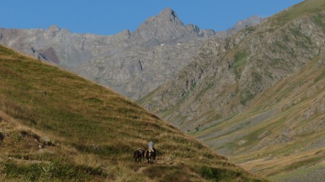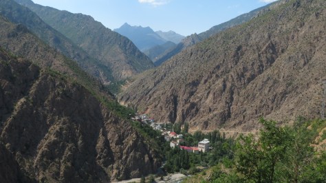 Je finis par retrouver un sentier de montagne et fais une pause à côté d’une fontaine avec trois bergers. Le plus âgé me raconte qu’il a fait deux ans de service militaire à la frontière chinoise à une époque où les relations entre l’URSS et la Chine n’étaient pas excellentes. Ils sont tous les trois sympathiques et en plus ils n’insistent pas pour que je boive de l’oghi. Je trinque avec eux avec la bonne eau fraîche de la fontaine. Il faut dire que j’ai eu une information importante hier soir quand Atush m’en a servi. Le taux d’alcool est de 62°. À ce niveau-là, c’est finalement pas étonnant de sentir le feu gagner le fond de la gorge. Il me faut être vigilant pour éviter les traquenards. Et aujourd’hui en milieu de journée avec la chaleur et encore du chemin, je ne me sentais pas de boire un verre.