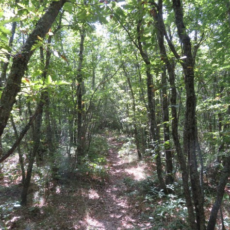 Contrairement à hier, le chemin était moins facile. Je devais passer d’ouest en est de vallon en vallon alors que la plupart des pistes étaient elles sur les hauteurs et orientées nord sud. Chaque descente puis remontée était assez sauvage, à travers bois. Une des montées était plus technique, raide avec des rochers qu’il fallait escalader. À chaque fois que j’étais dans ces passages plus difficiles ou au milieu de la végétation, la pluie se mettait à tomber.
