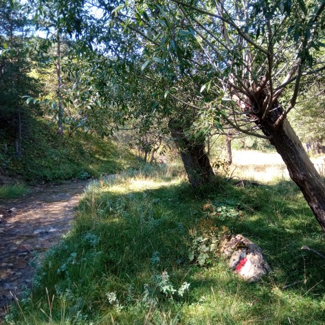 Le début est une vaste piste assez fréquentée par les forestiers qui montent travailler. Il y a même quelques tunnels dans les passages encaissés. Au fur et à mesure que je remonte la vallée et laisse des vallons adjacents, le chemin se fait de plus en plus sauvage. Les derniers kilomètres sont sur une vieille piste abandonnée en partie détruite par les inondations. Cela renforce mon inquiétude. Je marche d’un bon pas pour arriver au point clé en espérant être rassuré. Effectivement au fond du vallon, une piste le quitte pour monter vers les hauteurs. C’est bon pour aujourd’hui et je peux continuer serein.