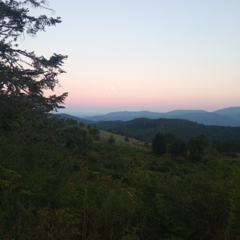 La journée se termine alors que la lune est levée. Je plante la tente. À 1200 mètres d’altitude la nuit risque d’être fraîche.