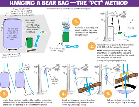 Comme sur l’Appalachian Trail, avais 20 mètres de corde, un mousqueton et un sac étanche pour suspendre la nourriture en utilisant la méthode PCT (Pacific Crest Trail). Je l’ai finalement pas utilisé car je n’ai jamais campé en forêt.