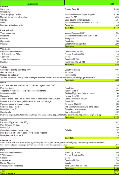 Sans être un puriste de la marche ultra légère, moins de 8kg porté hors eau et nourriture me parait très raisonnable pour être autonome et pouvoir rester confortable par des températures légèrement négatives.