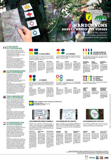 Marquage des sentiers : Héritage de la période allemande (?), le système de balisage est différent de celui de la Fédération Française de Randonnée Pédestre (voir photo ci-dessous). C’est le Club Vosgien qui s’en occupe et le balisage est excellent. La plupart du temps, il n’est pas nécessaire de regarder la carte. Lorsque j’ai quitté le GR, certains secteurs nécessitaient de l’attention notamment car il y a beaucoup de sentiers secondaires et il est facile de se tromper.
