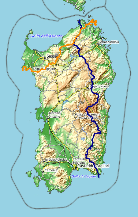 - Trace GPS de la traversée à pied Ouest-Est de la Sardaigne : Attention ! Il s’agit d’un projet de tracé. Il convient dans tous les cas de privilégier la réalité sur le terrain. En cas de passage sur un terrain privé, s’assurer de l’autorisation du propriétaire.