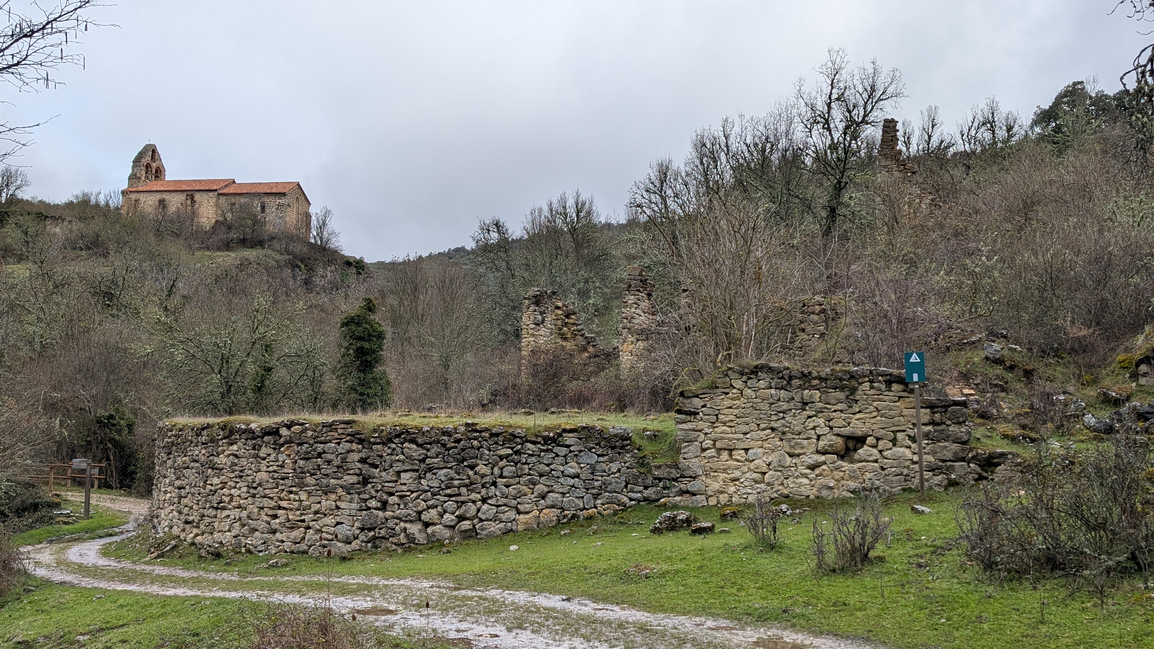 Je poursuis vers le sud mais j’ai encore un dernier passage dans le Pays Basque. La limite entre cette région et la Castille est un peu tortueuse. Depuis hier, je passe plusieurs fois de l’une à l’autre. Le village abandonné de Ribera que je traverse au milieu de l’étape est au bout du bout de la province basque d’Alava. En 1940, soixante habitants vivaient ici. Le village ne s’est complètement vidé qu’à la fin des années 60. C’est assez récent. Quand je suis né, des gens habitaient ici. Les maisons étaient debout. Des maisons, il ne reste que des pans de murs envahis par les ronces. C’est impressionnant comment en guère plus d’un demi-siècle, la nature a repris ses droits. L’église du XIIIè qui menaçait aussi de tomber en ruines a été restaurée. La charpente est neuve. Je peux rentrer à l’intérieur pour voir de belles fresques.