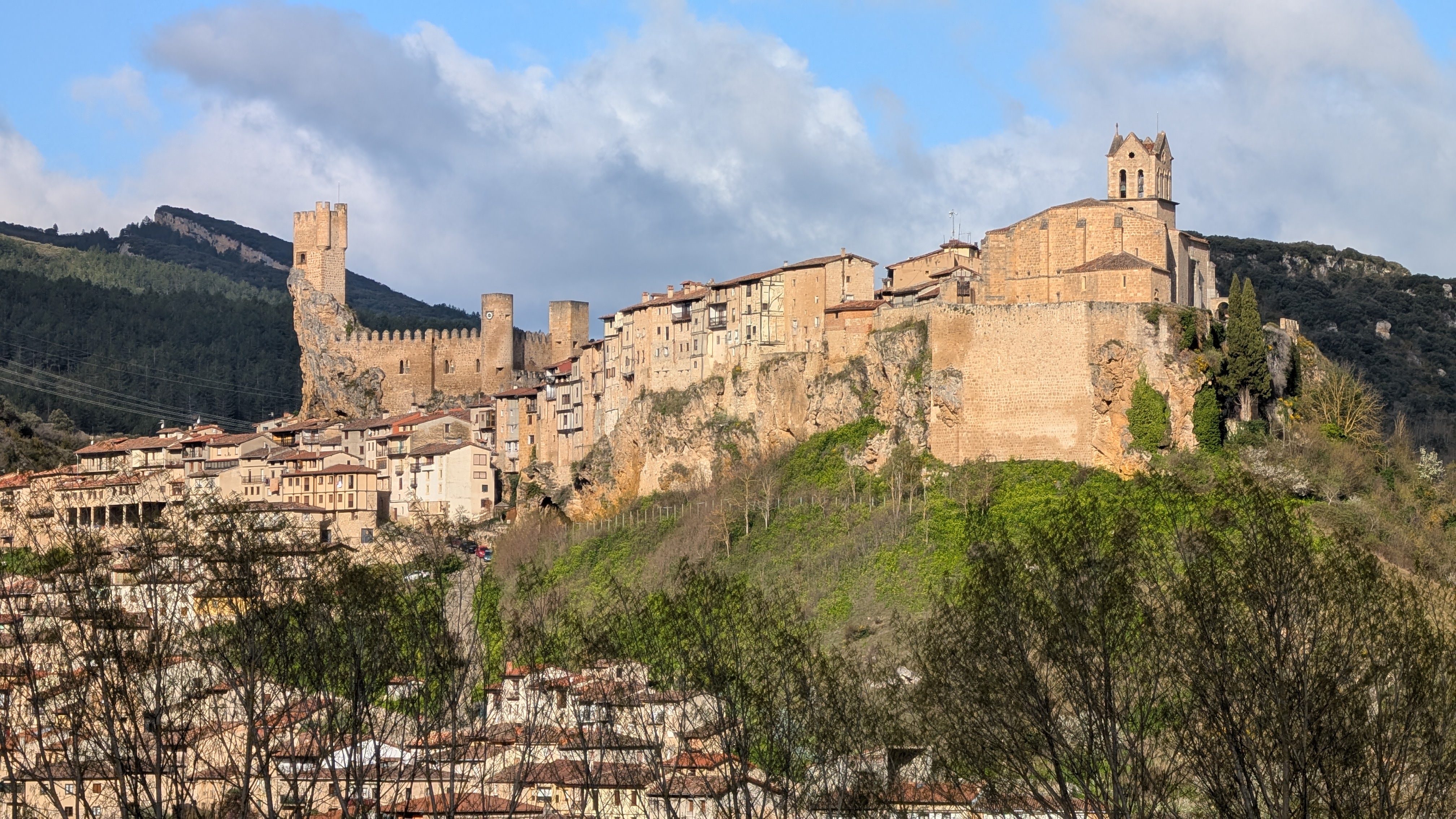 Ce matin, l’église de Frias, perchée sur un rocher apparaît au loin, illuminée par un rayon de soleil. Un arc en ciel et les nuages complètent le tableau. Arrivé au bord de l’Èbre, j’ai droit aussi à une très belle lumière. Plus loin, c’est toute la cité médiévale de Frías qui resplendit sous le soleil avec son église au bout d’un promontoire, la tour du château en équilibre sur un rocher et ses maisons suspendues à flanc de falaise.