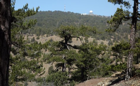 Après la foule de Troodos, je retrouve des chemins déserts. Je marche tranquillement ; l’option hors sentier E4 pour passer par le sommet ne pose pas de problème. Trois mouflons, et il est rare d’en voir, semblent surpris de me trouver là.