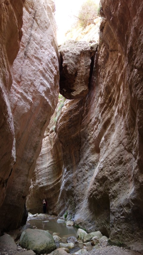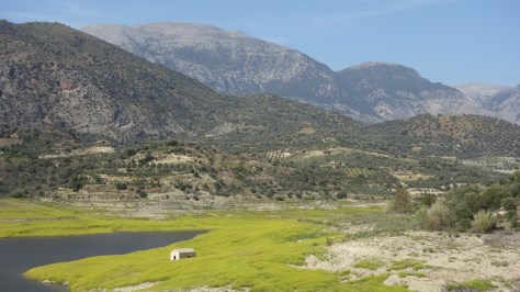 Passé les ruines plus suggestives qu’impressionnantes de l’ancien palais, je remonte de belles gorges encaissées avant de prendre de la hauteur. Le chemin passe par une succession de cuvettes cultivées au milieu d’un paysage très minéral. Le contraste entre le vert profond des champs parsemés de fleurs et les ocres des rochers est superbe. Je marche sur de bons chemins. Je me régale. La traversée de la Crète débute sur de bonnes bases.