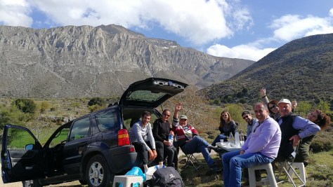 En redescendant des montagnes Dhikti, j’arrive après la procession qui se déroulait dans l’après-midi à la chapelle Agio Pnevma sur le plateau de Limnakaro. Les familles du plateau de Lassithi en ont profité pour pique-niquer autour de la chapelle. Même si j’arrive à la fin des libations, je suis invité au passage par une famille. J’ai droit au raki crétois. Contrairement au raki turc, il n’est pas à base d’anis ; c’est un alcool de raisin. C’est bon, moins fort qu’une liqueur mais après 2 verres, je préfère arrêter, il me reste encore de la marche. Même si certains parlent anglais, j’apprécie de pouvoir aussi communiquer en Grec au moins pour expliquer ce que je fais, que je trouve la Crète très belle etc…