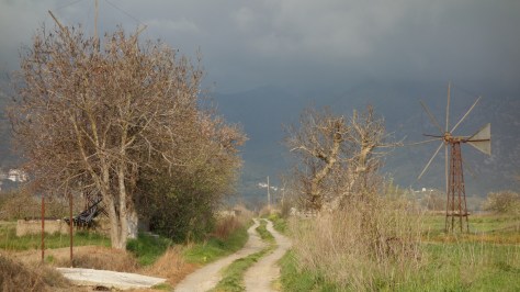Le chemin file droit sur le plateau de Lassithi. À cette heure matinale, la campagne est déserte. Des anciens moulins pour pomper l’eau ne subsistent que les carcasses rouillées et figées. J’entends au loin les aboiements des chiens ou la volée des cloches des villages voisins. Le ciel est vraiment nuageux, noir, pour la première fois depuis le départ ; quelques grondements du tonnerre annoncent l’orage qui, finalement, ne viendra pas.