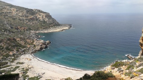 J’ai aussi rencontré ma première randonneuse sur le chemin E4, une suédoise qui a débuté quelques jours avant moi. Elle a continué un peu sa route ce soir. Pour moi, la journée a été assez longue. Une petite butte avec vue sur la mer lybienne, un robinet d’eau, l’endroit est parfait pour la nuit.