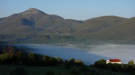 Après une visite de la très belle église Panagia tou Araka, elle aussi au patrimoine mondial de l’Unesco pour ses peintures du XIIe, je poursuis par un agréable sentier dans les montagnes. Je suis à plus de 1000 mètres d’altitude. Le fort et chaud vent du sud s’est arrêté au milieu de la nuit. Une brise du nord l’a remplacé. Au point le plus haut, je devrais avoir maintenant des gelées matinales. L’ambiance est hivernale. Il fait frais avec même quelques gouttes. Je planifiais une courte étape avec nuit dans un hôtel de Spilia. Il est complet. Je poursuis donc et trouve une belle aire de camping. Ce sera nuit froide dans les montagnes.