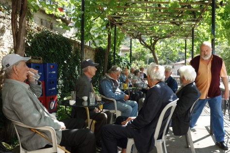Hier c’était les yiayia angels, aujourd’hui, à la taverne de Meseleri, un crétois m’invite à boire une bière et à partager la fin de leur repas. J’ai déjà mangé une copieuse salade grecque, une brochette de porc avec des frites accompagnés déjà d’une bière. Mais expérience de l’Appalachian Trail aidant, je ne fais pas la fine bouche. Il vaut mieux trop manger ; de toute façon, j’élimine ensuite.
