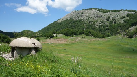 Un slovène me racontait hier que son père, né italien, avait fait son service militaire en Sicile et en Afrique, puis sa carrière professionnelle en Yougoslavie avant de terminer sa retraite en Slovénie, tout cela sans déménager. En moins d’un siècle, de 1918 à 1991, cette région a été successivement austro-hongroise, italienne, yougoslave et slovène. On peut voir le long du chemin des éléments de défense, bunkers… que Mussolini avait fait construire pour défendre la frontière.