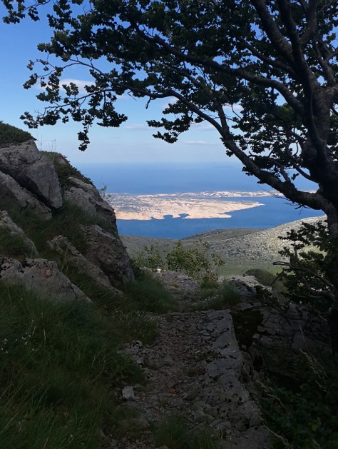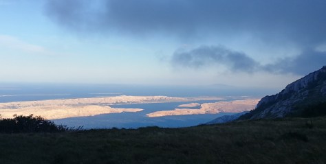 Jour de bura. Nous sommes le 26 juin, en plein été. En cette saison, la chaleur peut être torride, accablante en Croatie. En quittant, le refuge Šugarska Doliba, je domine les îles de la côte dalmate, étincelantes de blancheur sous le soleil matinal. Il aura fallu attendre cette fin juin pour commencer à marcher avec polardine, doudoune avec la capuche et gants…Je ne suis pourtant pas à une altitude extrême, juste 1200 mètres, au-dessus de ces îles qui sont là à mes pieds. C’est jour de bura, ce vent violent, froid, qui vient du nord. Je courbe le dos sous les violentes rafales qui peuvent avoir des pointes à 100 kilomètres heures. Ce vent est à la Croatie ce qu’est le vent d’autan chez nous. On a parfois l’impression que c’est fini, que le temps se calme quand surgit une violente rafale. Les croates du refuge m’ont dit que des camions pouvaient être renversés lors des jours de forte bura. Ils abandonnent leurs projets et redescendent.