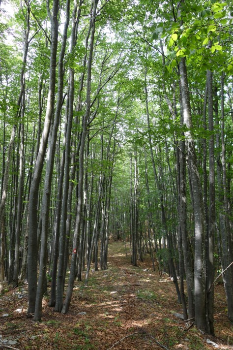 À l’approche de cette frontière, je prête attention aux éventuels bruits de voitures mais le secteur est calme. Je suis dans de belles forêts de hêtres qui se traversent sans difficultés.