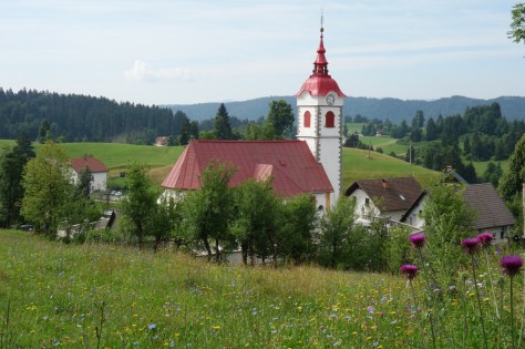 Mais c’est en Autriche que j’ai l’impression d’être. J’ai vraiment changé d’environnement et de paysage. Je marche au milieu d’alpages et forêts. Les prairies sont impeccables, bien vertes et l’herbe est rase. Au loin, les sommets des Alpes Juliennes commencent à se deviner. Des chalets, granges complètent ce paysage.